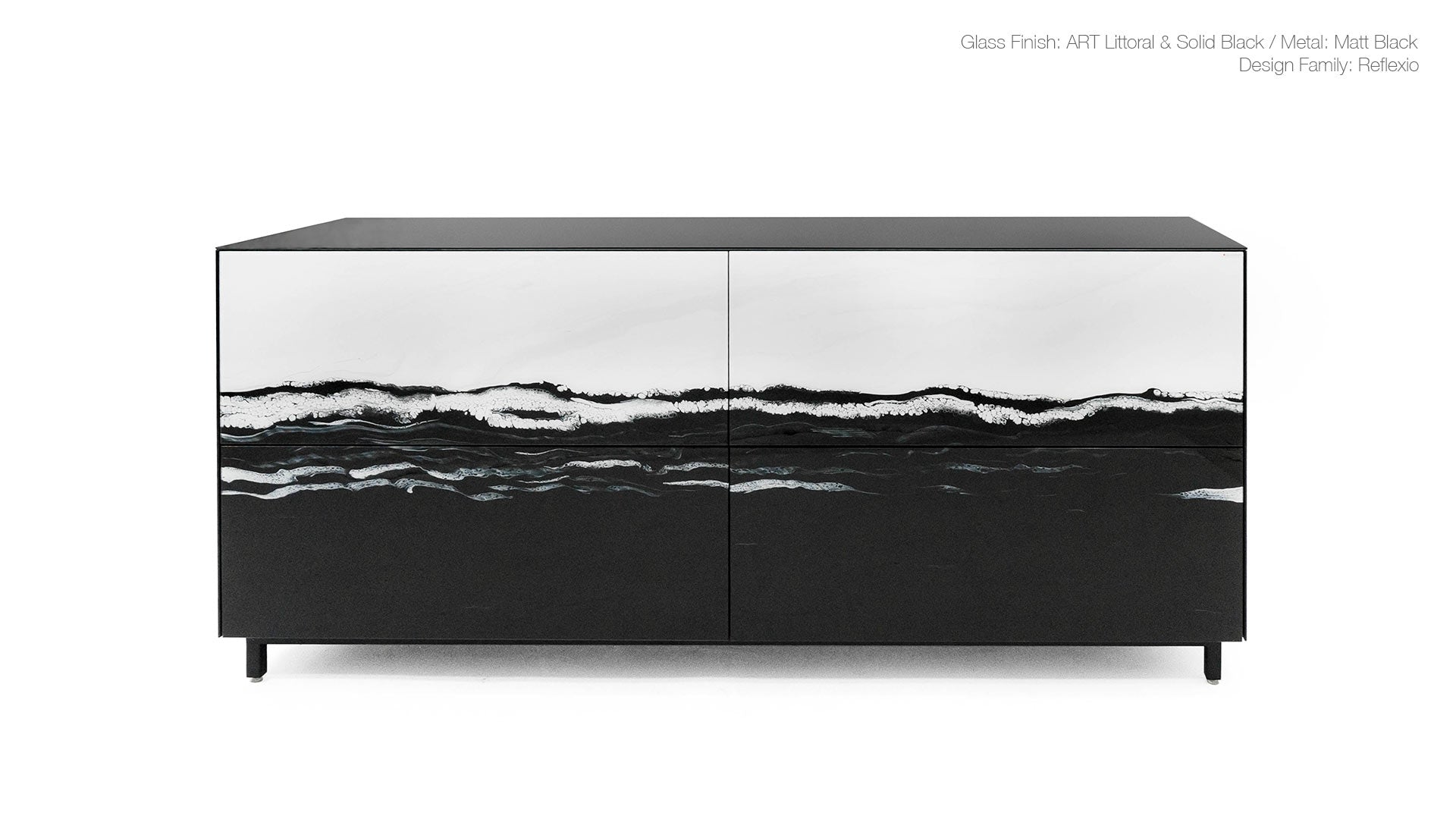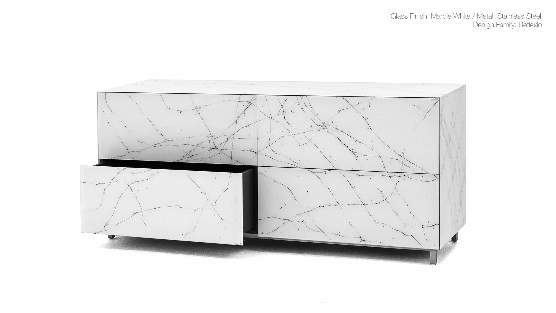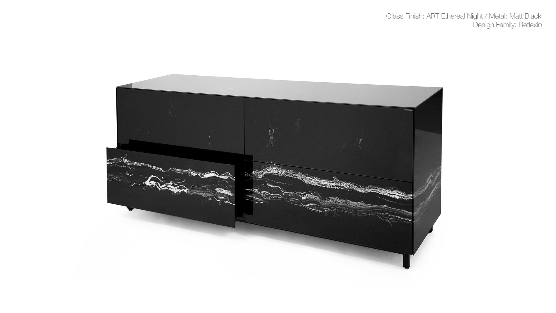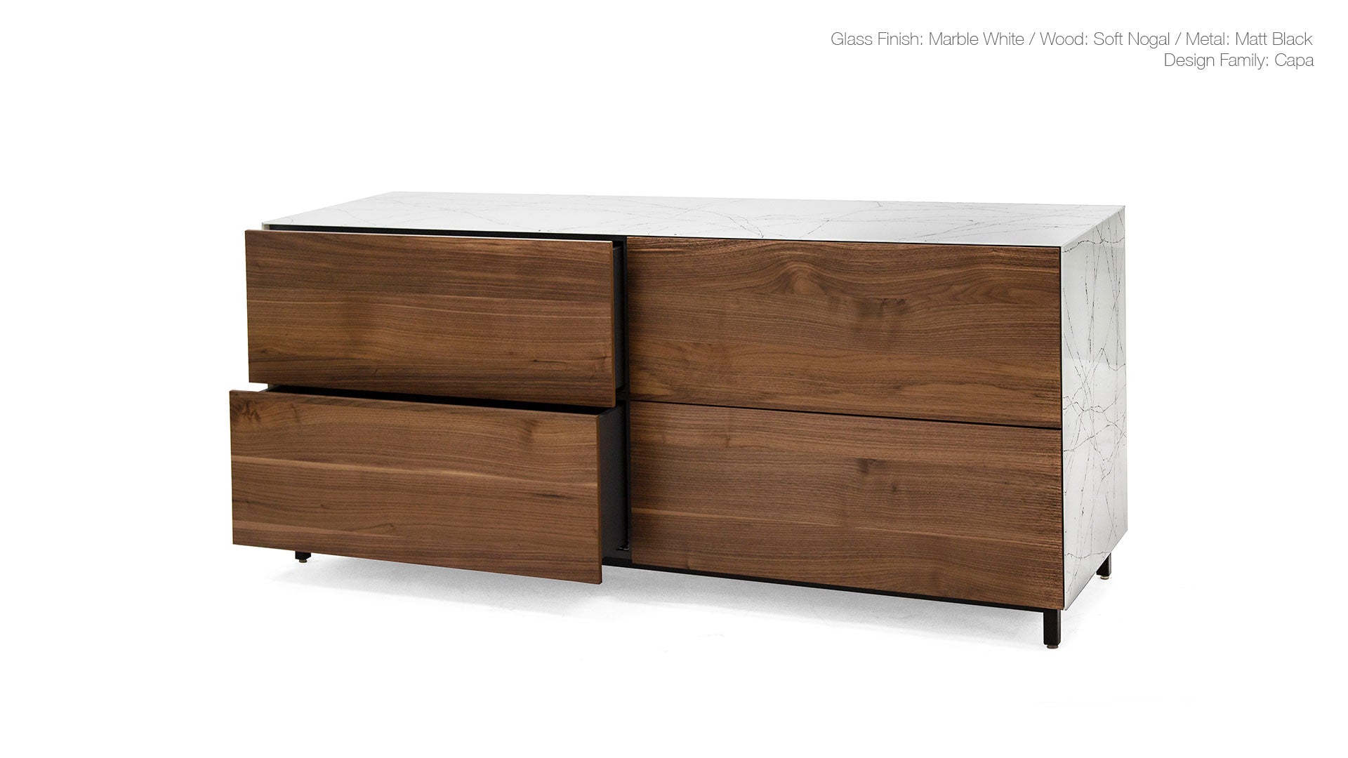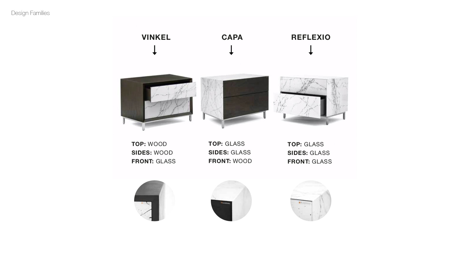 General Specs 4mm extraclear tempered glass drawers with concealed runners & push-open system. Melamine interior body (Reflexio & Capa). Wood finish in lacquered natural oak or walnut veneer (Vinkel & Capa). Metal legs with adjustable levelers.