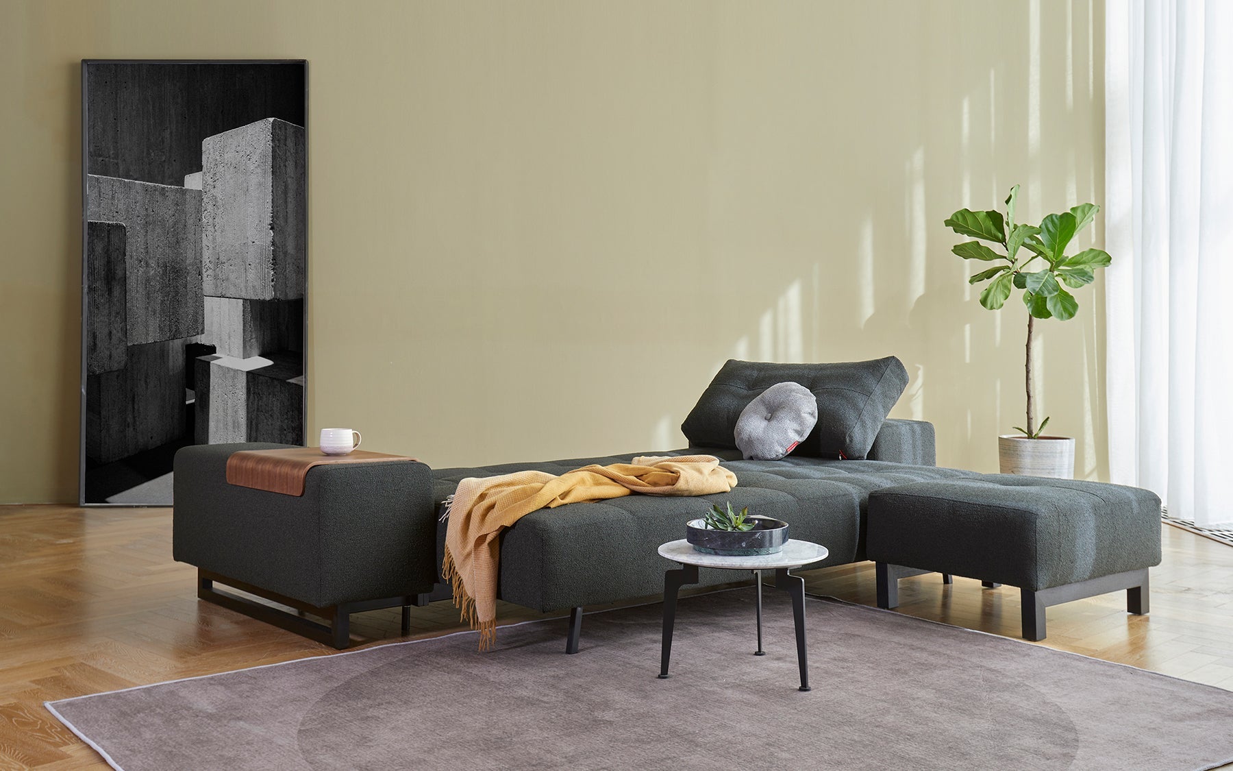 Featuring a sizeable seating and sleeping surface, Grand provides a design that is comfortable and impressive. Featuring contemporary functionality as its supporting legs used to convert from sofa to bed have an ingenious lock mechanism and are neatly hidden under the seat when in sofa position. Reflecting the compact living trend, Grand’s multifunctional design easily accommodates three persons to sit, or two-person to rest when converted into a bed. Its excess pocket spring comfort provides a pleasant comfort for sitting, resting and socializing. Fulfill the sofa arrangement with the D.E.L ottoman for a movable chaise lounge or temporary seat. The exquisite details of the stitched textile surfaces combined with the large padded armrests and the two walnut veneer arm trays provide a design that combine modern elegance with contemporary functionality and longevity.