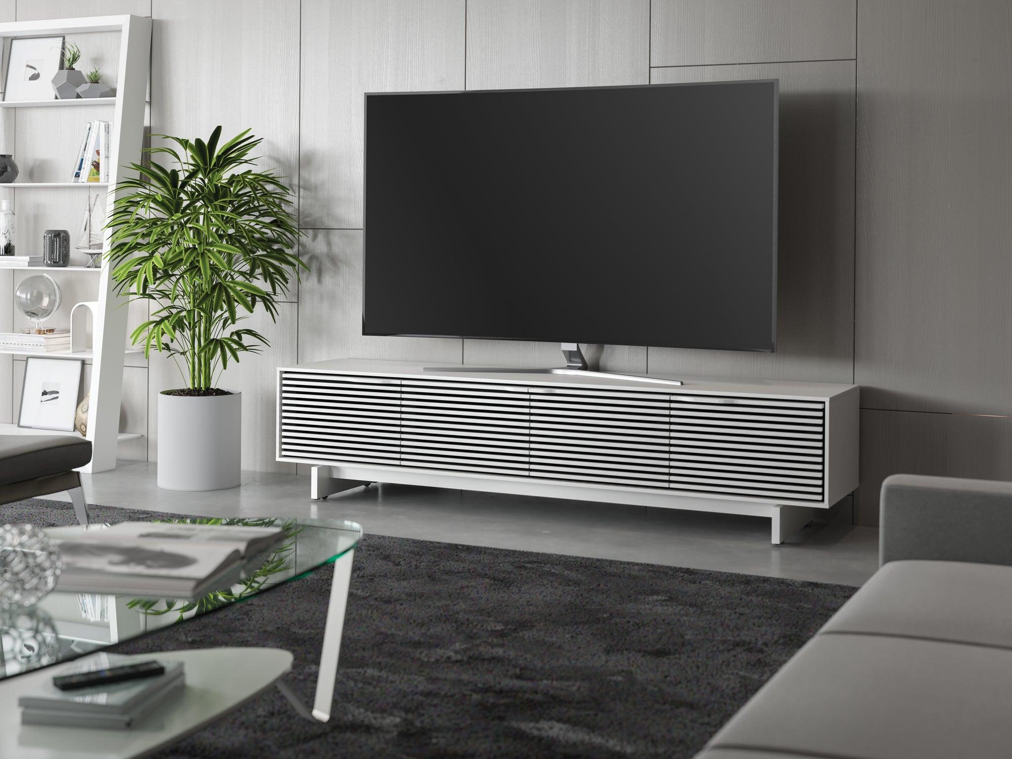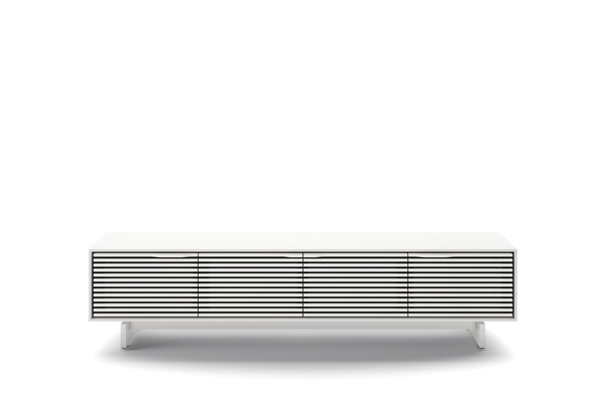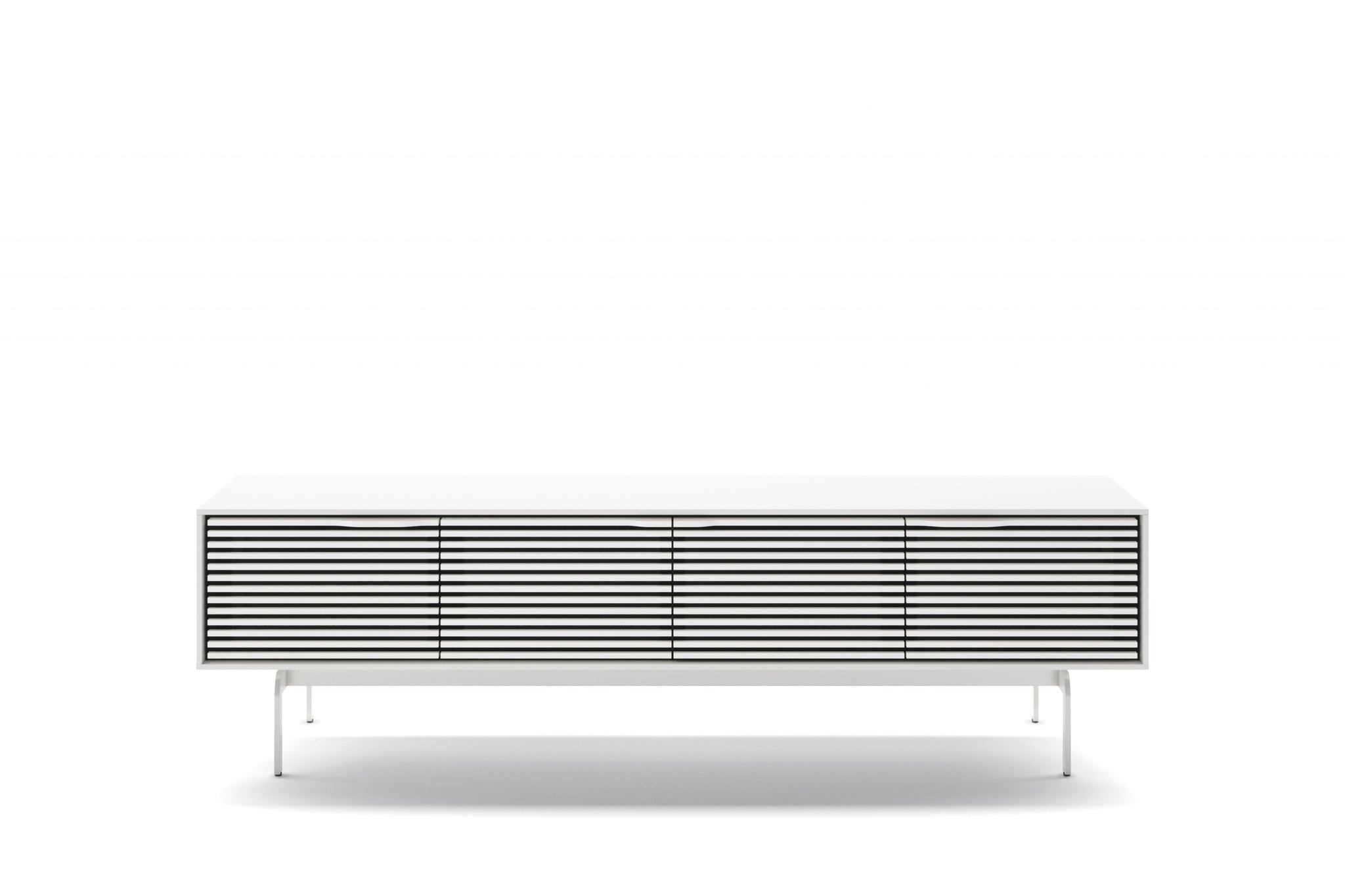 The Align 7473 is a full-featured and low-profile modern TV stand and credenza design that pairs remote and audio-friendly louvered doors with your choice of two available base styles, media or console. TV size: up to 85".
